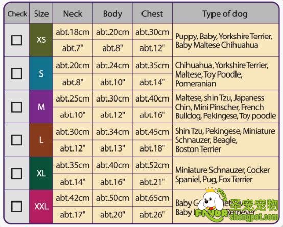Neck:颈围 Body:身长 Chest:腰围
