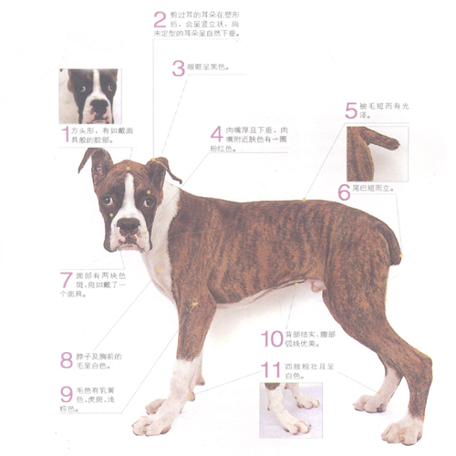 头部:头部的漂亮外形取决于吻部与颅骨比例协调。吻部的长度等于从枕部到鼻尖端长度的1/3,宽度等于颅骨宽度的2/3。头部不能有深的皱纹。耳直立时,皱纹出现在前额。皮褶从眉头两侧延伸到吻部两侧。表情——聪明而机警。眼——深褐色,中等大小,既不突出也不凹陷。眼神和前额的皱纹构成拳狮犬独特的表情。耳——耳根位置在颅骨的最高点,剪耳后的耳长,逐渐变尖。当犬处于戒备状态时,耳直立。颅骨——颅骨顶部略呈拱形,不圆,也不平坦。枕部不十分突出。两眼之间有一凹痕,鼻梁轮廓清晰。面颊比较平坦。颅骨向吻部尖端逐渐变细,形成一优美的曲线。吻部——吻部的长度、宽度和深度比例协调。吻部的形状由两侧颇骨、牙床和嘴唇形成。吻部顶部不能倾斜,也不能凹陷。但鼻尖端比吻部根部稍高。鼻子较宽,颜色为黑色。