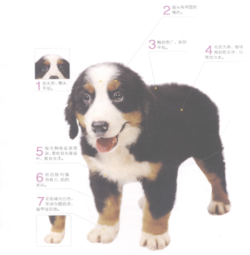 伯恩山犬有着强而有力的身躯,四肢肌肉发达:额头平坦,眉头有明显的褐色:被毛稍卷呈波浪状,柔软而具有光泽;毛色为黑、咖啡和白色交杂,以黑色为主,胸部、头部和四肢则掺有白色和咖啡色。三色分明者为优质犬。