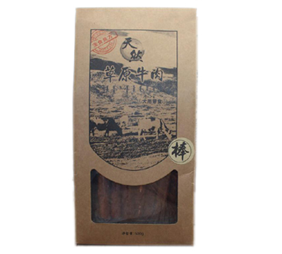 草原牛肉系列产品,开袋即可闻到牛肉的香气,入口有嚼劲,肉质明显。