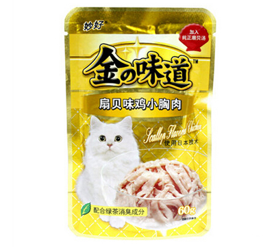 1.以精选鸡肉、鲣鱼、小银鱼等为主料,配以猫咪喜爱的鲜味浓郁的扇贝汤,脂肪低且营养丰富。