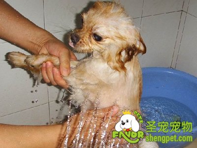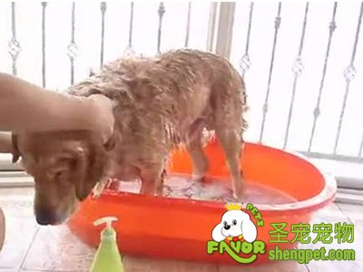 狗儿在饲主左侧站立定位;将温水顺着背部、肩部、臀部、腹背、四肢的顺序稍微淋湿,再抹上宠物专用洗洁剂,轻度揉搓后,快速用梳子刷洗;冲洗时用手按压两侧肛门,将其分泌物排出来。