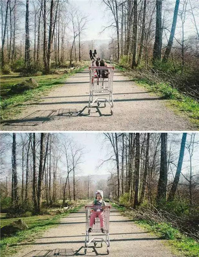 在她拍摄的一系列照片中,艾拉和查理身着相同着装,摆出相同的姿势,吃相同的食物,连打盹儿的姿势都完全一致。他们个头相似,在相同的背景环境下还会做相同的滑稽动作。还有他们和爸爸妈妈在一起的照片,看起来也颇为相似。