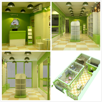 宠物美容技术培训等,下面是圣宠总部的设计部为其设计的店面装修设计图:
