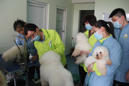 宠物美容培训学校,为让加盟商更好的学习宠物店需要的技术,特别开设了45天的店铺技术班,准对店铺的需求进行详细的讲解,除了4天的基础剪刀练习外,其余时间全部是活体狗狗练习,并有老师亲自指导评价,每一段时间老师还会进行阶段的测试来测验技术的掌握程度。