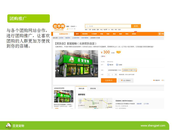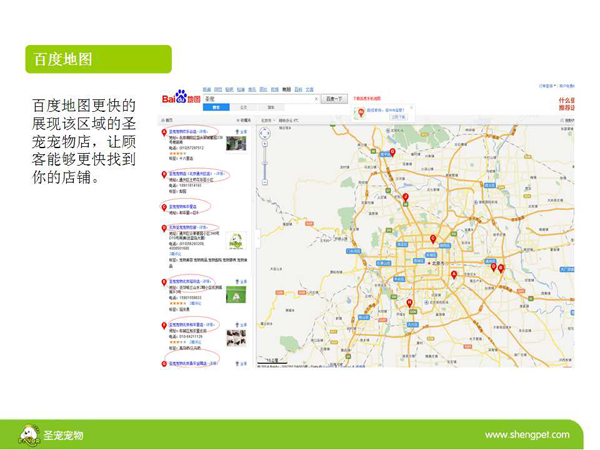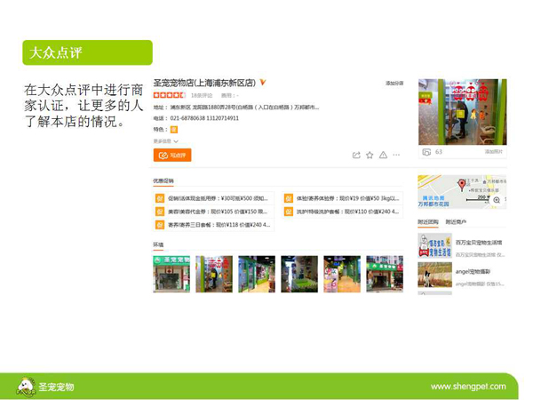 推广宣传方面 圣宠采取线上线下相结合的方式为加盟商全方位的宣传推广,从百度搜索、地图、点评、团购、微信、微博等等,各大主流媒体投放宣传。 国内第一大搜索引百度投放推广