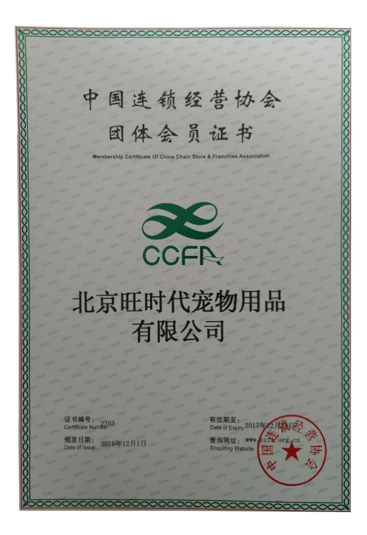 热烈庆祝北京旺时代宠物用品有限公司荣获中国连锁经营协会团体会员证书! 中国连锁经营协会于 1997 年在民政部注册成立,是连锁经营领域唯一的全国性行业组织。团……查看全文>>