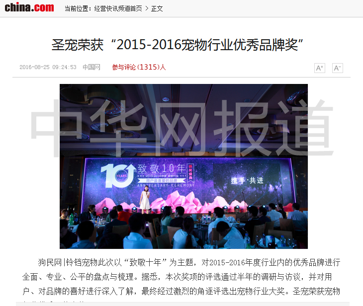 中华网报道:由中国最大的宠物社区平台狗民网|铃铛宠物倾力打造的 2015-2016宠物行业用户最喜爱的品牌颁奖盛典8月18日在上海世博洲际酒店圆满落幕。圣宠品牌受邀出……查看全文>>