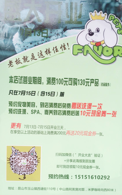圣宠宠物店(昆山玉山店))是圣宠旗下位于江苏的一家宠物加盟店,本店地址位于江苏省昆山市玉山镇西塘街111号(中山路阿英煲对面,米萝咖啡向西25米),现本店已经正式开业,凡是在本店开业期间进店消费者,皆可获得由圣宠宠物提供的好礼一份!圣宠