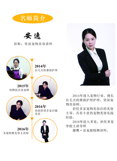 安逸 (资深宠物美容讲师) 2014年进入宠物行业,擅长长毛犬的赛级护理护理,资深宠物美容师。 担任多家宠物美容店的美容主导,具有丰富的宠物美容实战经验。 2016年进入圣宠,担任圣宠学校主讲导师雄鹰·京宠展特聘讲师。