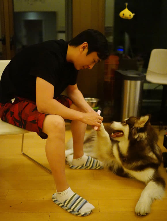 宠物店的“春天"来临了,王思聪穿着拖鞋,为爱犬细心修着指甲,而“王可可”则一副安静地享受状态,不时望向王思聪。好幸福啊!