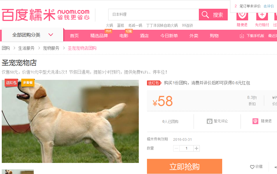 圣宠宠物与百度糯米达成企业合作,百度糯米是百度公司旗下连接本地生活服务的平台,是百度三大O2O产品之一。