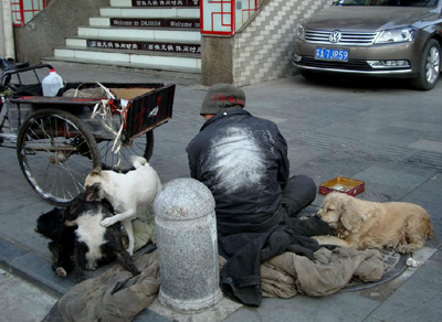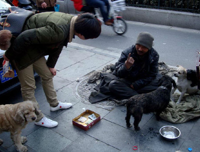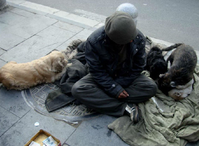 1月23日上午,市民武先生在南京白下区洪武路天桥下看到,来自安徽的流浪汉老王带着他收养的几只流浪病狗坐在街头乞讨。