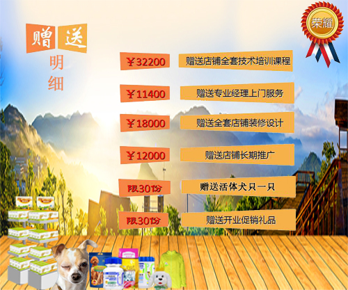 加盟费¥36000元 赠送整套培训(店长管理课程、美容技术课程、宠物训导课程、创意造型课程) 赠送免费上门服务 赠送店面装修设计 赠送店面宣传推广 赠送活体犬只一只(常见犬种)---限30份。 赠送开业促销礼品---限30份(市值千元)。