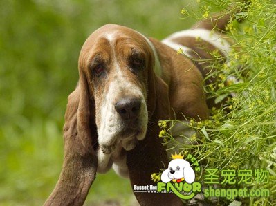 巴吉度猎犬为全整的尾巴,其位于脊椎的延伸的位置,略微卷曲,且十分欢快的举着。