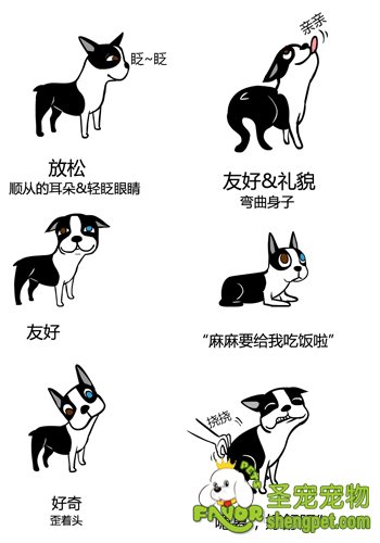 尾巴与狗狗的品种相关,但一般会把尾巴立起。四肢处于放松状态。像主人撒娇的时候,还会四肢伸展,像伸懒腰的姿态。