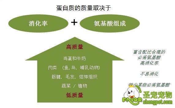 蛋白质的质量取决于蛋白质本身的消化率及氨基酸组成。食物中有些物质是不能够被消化和吸收的,其中的营养物质被机体吸收的效率就是消化率。蛋白质由必需和非必需氨基酸组成,其消化率一般在50%到95%不等。只有那些必需氨基酸配比合理、消化率高的蛋白质才算得上是高质量蛋白,如鸡蛋、牛奶等。宠物主人在为猫、犬准备日常饮食时,可参考下图为爱宠选择高质量蛋白。
