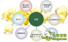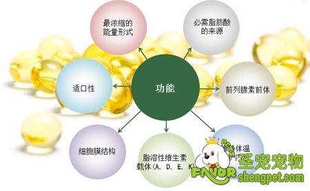 脂肪是猫犬最浓缩的能量来源,每克脂肪可以提供比蛋白质和碳水化合物两倍多的能量。当然,除了提供能量来源,脂肪还有很多别的作用,比如它是脂溶性维生素的载体,可以让身体更好地吸收营养;它也是构成细胞膜结构的重要物质,可提高细胞膜的硬度;它还可以为食物增添适口性。下图展示了脂肪的作用: