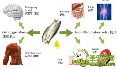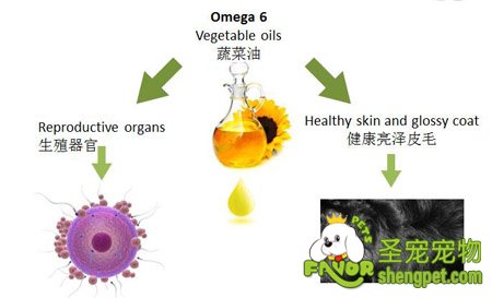 脂肪也是必需脂肪酸的来源。必需脂肪酸是指不能被机体合成、且对健康又非常重要的脂肪酸,它们必须从食物中获取。下图详细展示了对皮肤、肾功能及繁殖健康极为重要的必需脂肪酸:Omega-3与Omega-6在动物机体内的重要作用。