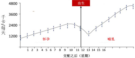 这一阶段的日常饮食中首先要确保母猫能摄入充足的能量。下图展示了母猫在怀孕期间与泌乳期间对能量的需求。可以看到,由于幼猫出生后前四周全靠母猫的乳汁生活,因此母猫在此时的能量需求远远大于妊娠期;同时,由于幼猫在头几周内成长非常快,因此对母猫的营养提出了更高的要求。