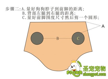 步骤二:1.量好狗狗脖子到前脚的距离。2.背部左腿到右腿的距离。3.量好前脚围度尺寸然后剪一个圆形。