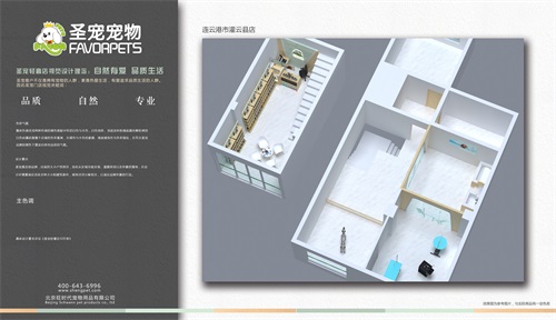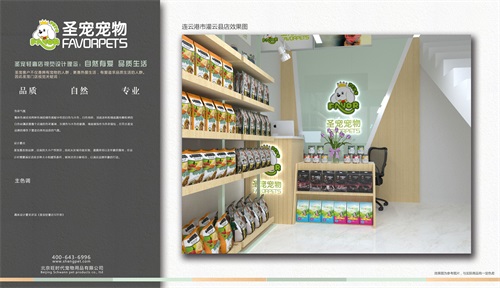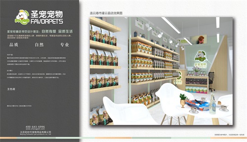 圣宠轻奢店视觉设计理念:自然有爱,品质生活。圣宠客户不仅是拥有宠物的人群,更是热爱生活,有爱追求品质生活的人群,因此圣宠总部为连云港市灌云县店设计装修效果图,以下就是连云港市灌云县店装修设计图: