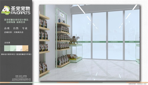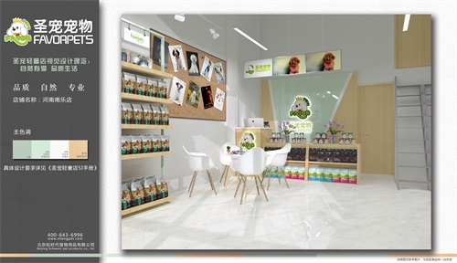 圣宠轻奢店视觉设计理念:自然有爱,品质生活。圣宠客户不仅是拥有宠物的人群,更是热爱生活,有爱追求品质生活的人群,因此圣宠总部为浙江金华东方前城店设计装修效果图,以下就是浙江金华东方前城店装修设计图: