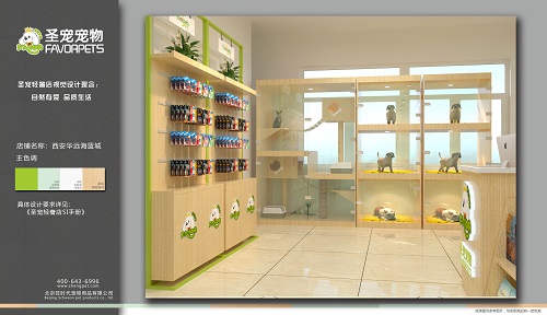 在与招商经理详细沟通中,候店主了解到圣宠为各位加盟商提供的开店前程的指导服务,包括前期的选址、装修、培训,后期的货源、客源提供等,真正实现了整店输出模式。候店主相信大品牌有保障,各项服务都更成熟、专业,所以在与爱人商量后,便决定签约加盟圣宠宠物连锁,店铺地址选在西安。以下就是圣宠宠物西安龙湖店的装修设计图: