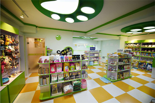 收银区背景墙以绿色草地为底背景,并将顶灯以狗狗脚印形状巧妙的表现出来,与店铺整体绿色融为一体,让顾客和“毛孩子”们进入店铺犹如进入乐园般,营造充满生活气息的氛围。
