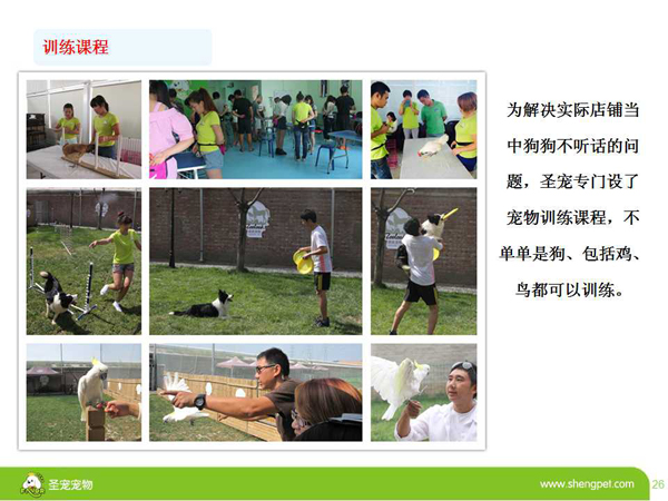 宠物训导课由国家一级宠物教练宁蔚老师(国内仅2名),国际著名指导手王树谦老师亲自授课,为加盟商决绝一切开店所需要的技术问题。