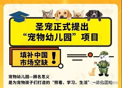 现如今,不少人都将宠物当自己的孩子来养,对于狗狗的疼爱自然少不了,但由于工作原因却没有时间陪狗狗,只能让狗狗孤零零在家,针对这种情况,圣宠正式提出“宠物幼儿园”项目,填补中国市场空缺。