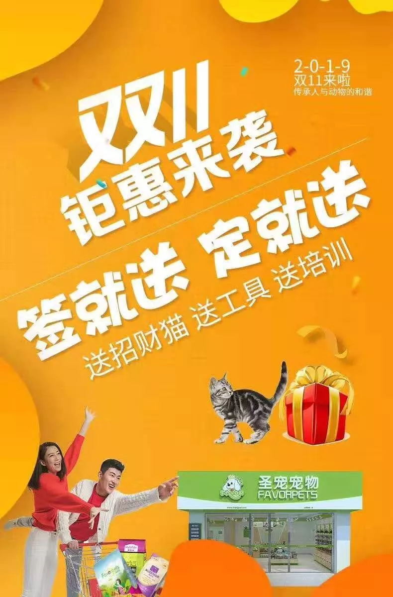 喜迎双十一,圣宠宠物推出特惠活动。11月签约即享受豪华大礼包免费送!