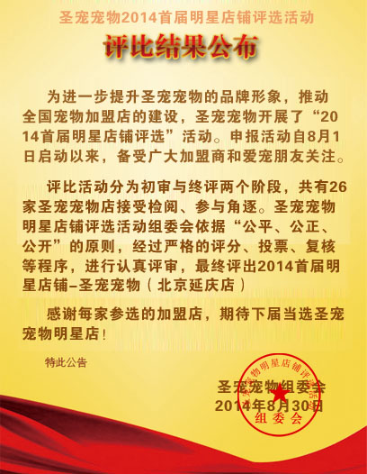 以“树品牌形象 展圣宠风采”为主题的圣宠宠物2014首届明星店铺评选活动,是圣宠品牌市场推广与提升的重要举措,目的在于通过树立标杆,规范宠物店标准,推动全国各地宠物店建设再上新台阶。因为圣宠宠物连锁店是宠物服务、提高产品附加值的最佳展示平台,是实现产品销售、提供优质服务的重要载体。同时也是圣宠品牌形象最直接、最真实的宣传窗口,是扎根市场的有力体现。因此,宠物连锁店服务的好坏直接影响到品牌和店铺的档次,直接影响到顾客消费欲望和购买行为,是圣宠宠物提升影响力的重要手段。