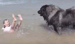 小主人和狗狗一起玩时,突然打来一个浪,将小主人掀了个跟头。