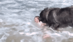 狗狗觉得小主人有危险,就赶紧冲了过去。叼起小女孩的衣服,要将她拖上岸。生怕她被海水冲走。