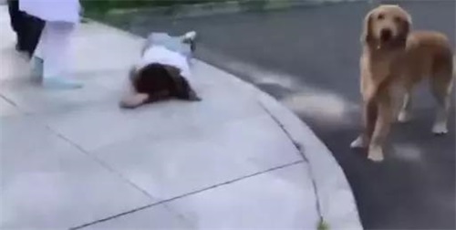 他的金毛犬看到主人晕倒非常着急,一直在主人身边打转。
