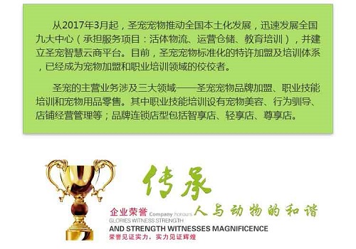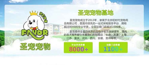 圣宠宠物成立于2013年,隶属于北京旺时代宠物用品有限公司,是国内领先的一站式保姆服务平台,拥有超过8000的毕业学员,全国加盟门店超过1100家。