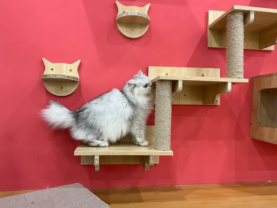 店铺有纯木质家具的单独隔间,24h排风系统,温度湿度专业控制,隔间以及公共空间都有摄像头可随时观看,不仅在有限空间内为猫咪提供了舒适的环境,也能让铲屎官随时了解主子的状况。